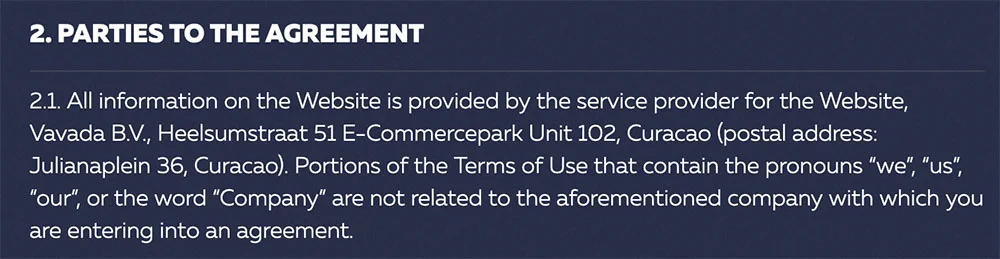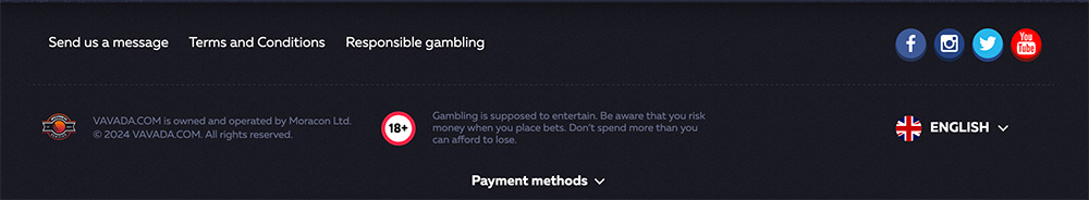 Näeme, et Vavadal puudub footeris litsentsi kohta info. Sellisel juhul tuleb avada “Terms and Conditions” ehk reeglite lehekülg. Seal on kenasti ka kirjas millises juristiktsioonis mängid.