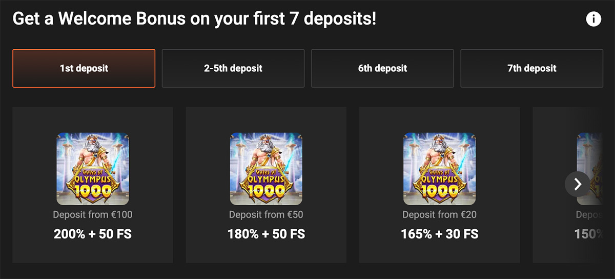 Esimene sissemakse: 200% boonust kuni 500 € + 50 tasuta spinni mängus Gates of Olympus 1000.
