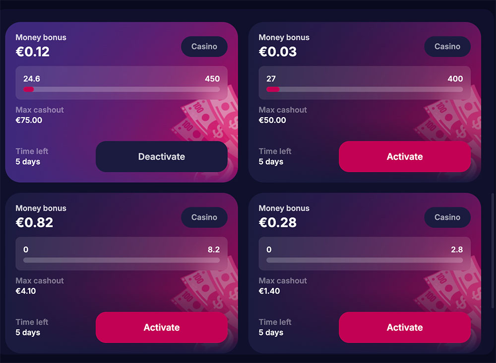 Esimene sissemakse: 100% boonus kuni 500 € + 100 tasuta spinni (50 spinni päevas)