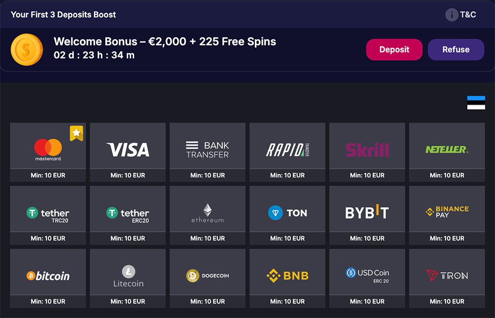 Uutele mängijatele on mõeldud kolmeosaline tervituspakett, mis võib kokku ulatuda kuni 2000 euroni ning sisaldab 225 tasuta spinni.